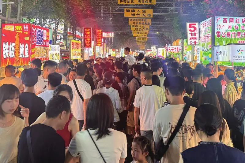 5月1日晚,走出南宁东站后,成都女孩小任打车前往“平西老牌美食夜市”,迫不及待地想尝尝华南地区的美味。但在夜市里看到一堆“铁板鱿鱼”“网红柠檬茶”的招牌后,小任困惑了:“怎么感觉南宁夜市和成都夜市差不多啊?”